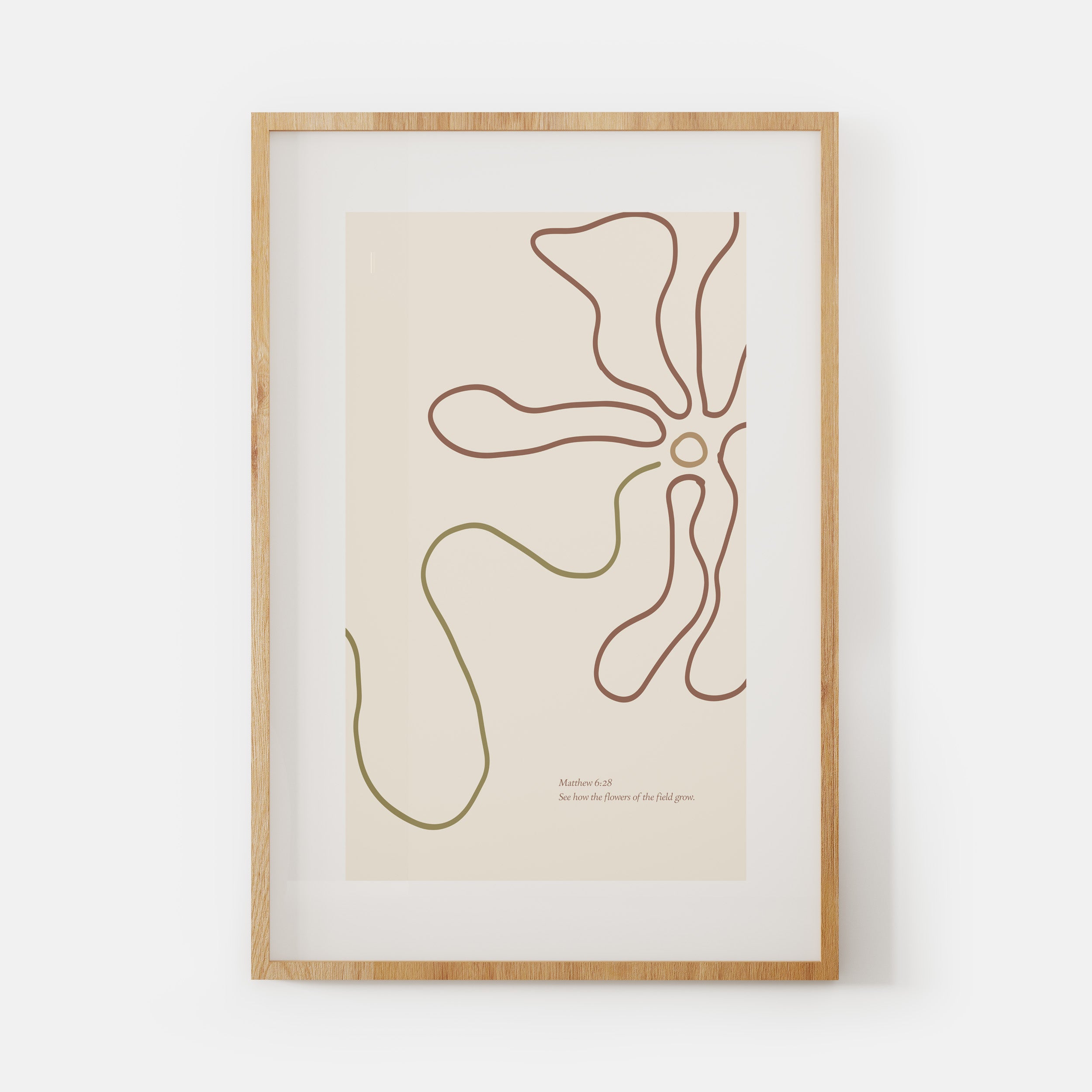 Inspired by Matthew 6:28 — See how the flowers of the field grow. Combining muted pastel colours, abstract minimalism and scripture - this print was created to remind us of the real peace of God that crushes anxiety in Jesus name.