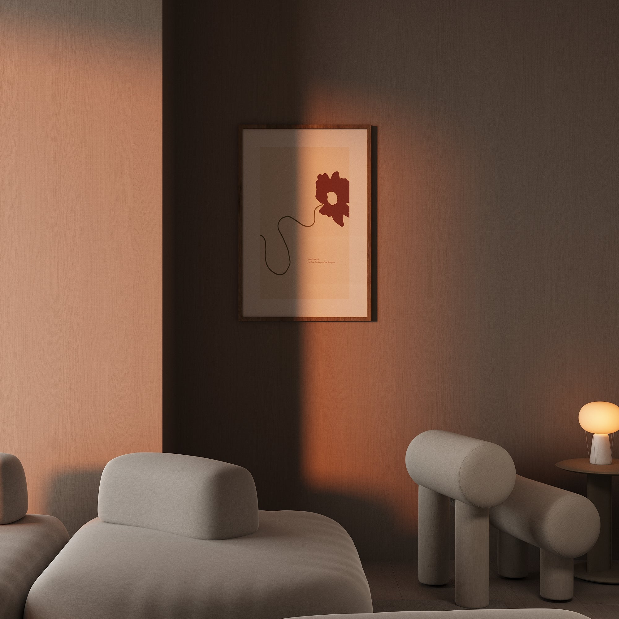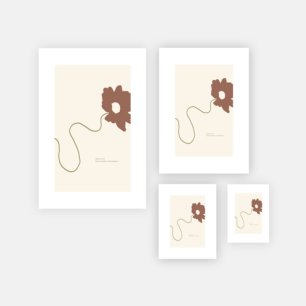 Inspired by Matthew 6:28 — See how the flowers of the field grow. Combining muted pastel colours, abstract minimalism and scripture - this print was created to remind us of the real peace of God that crushes anxiety in Jesus name.