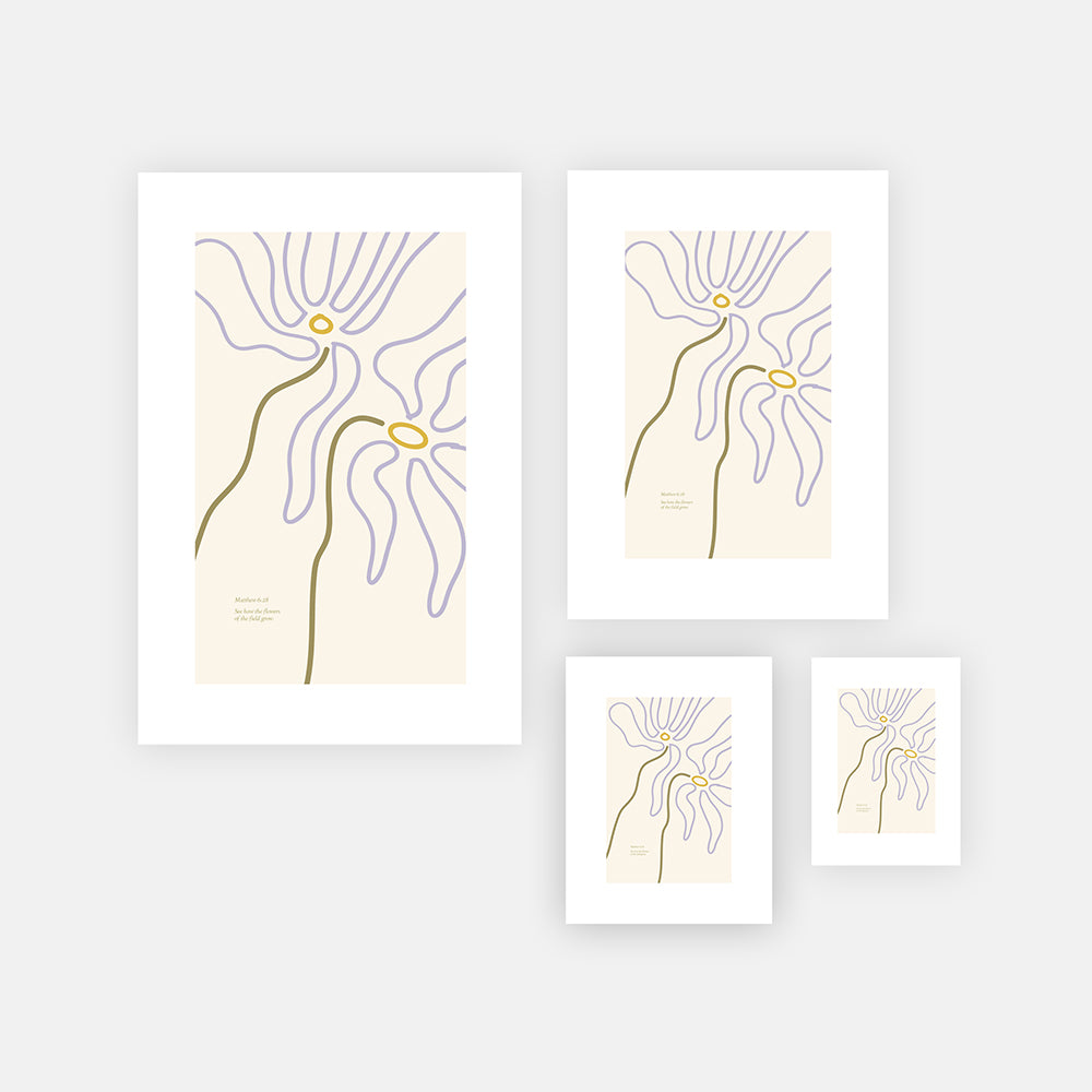 Inspired by Matthew 6:28 — See how the flowers of the field grow. Combining muted pastel colours, abstract minimalism and scripture - this print was created to remind us of the real peace of God that crushes anxiety in Jesus name.