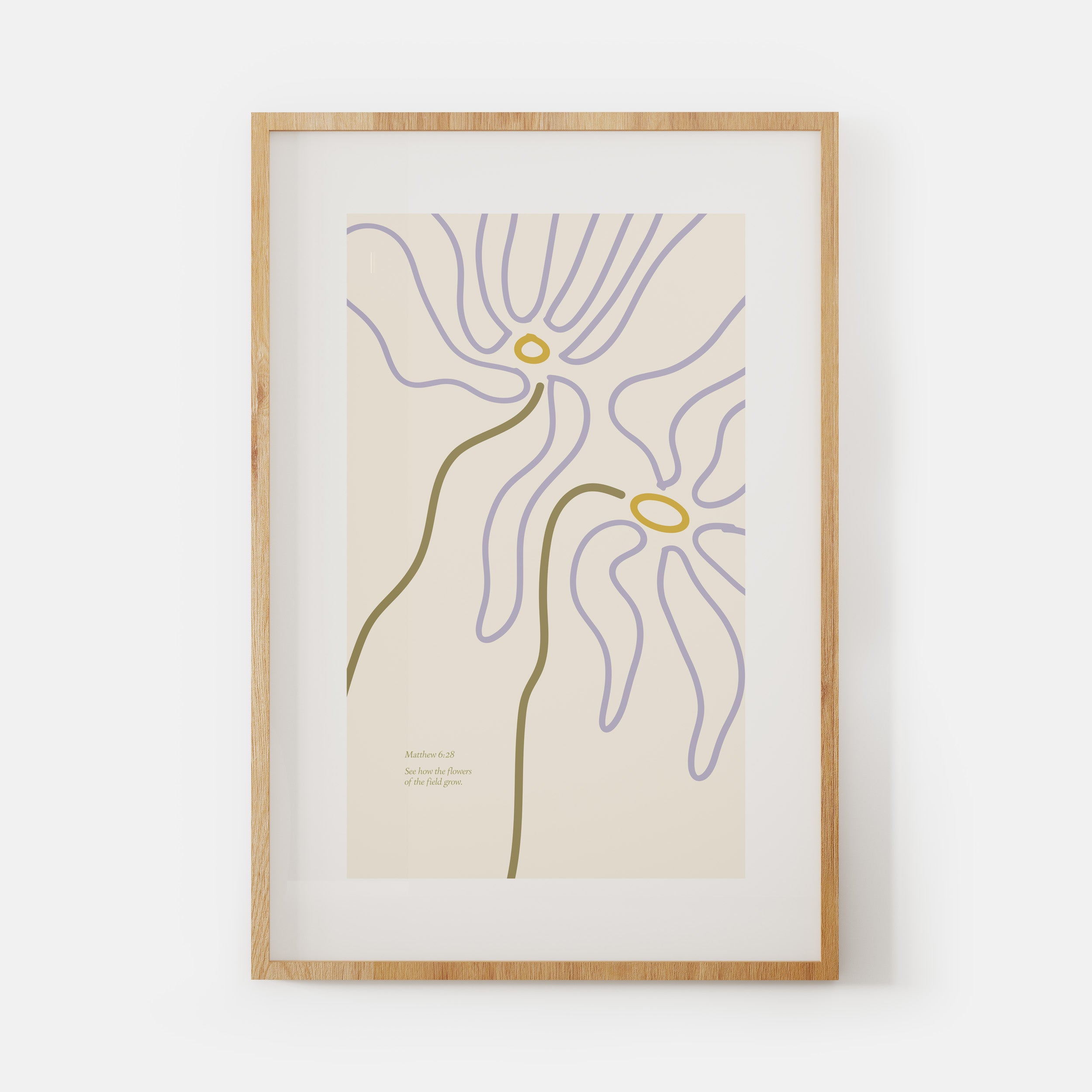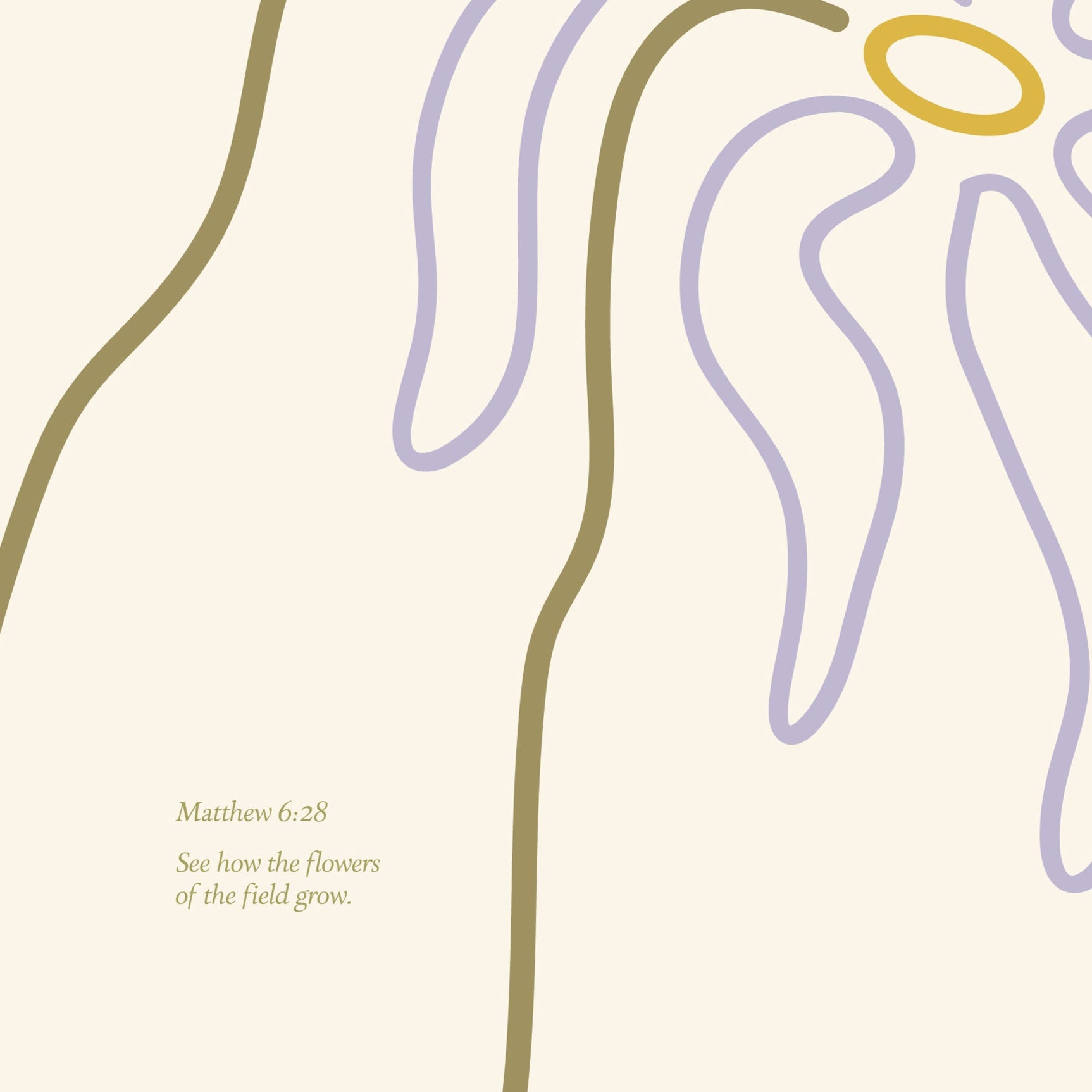 Inspired by Matthew 6:28 — See how the flowers of the field grow. Combining muted pastel colours, abstract minimalism and scripture - this print was created to remind us of the real peace of God that crushes anxiety in Jesus name.