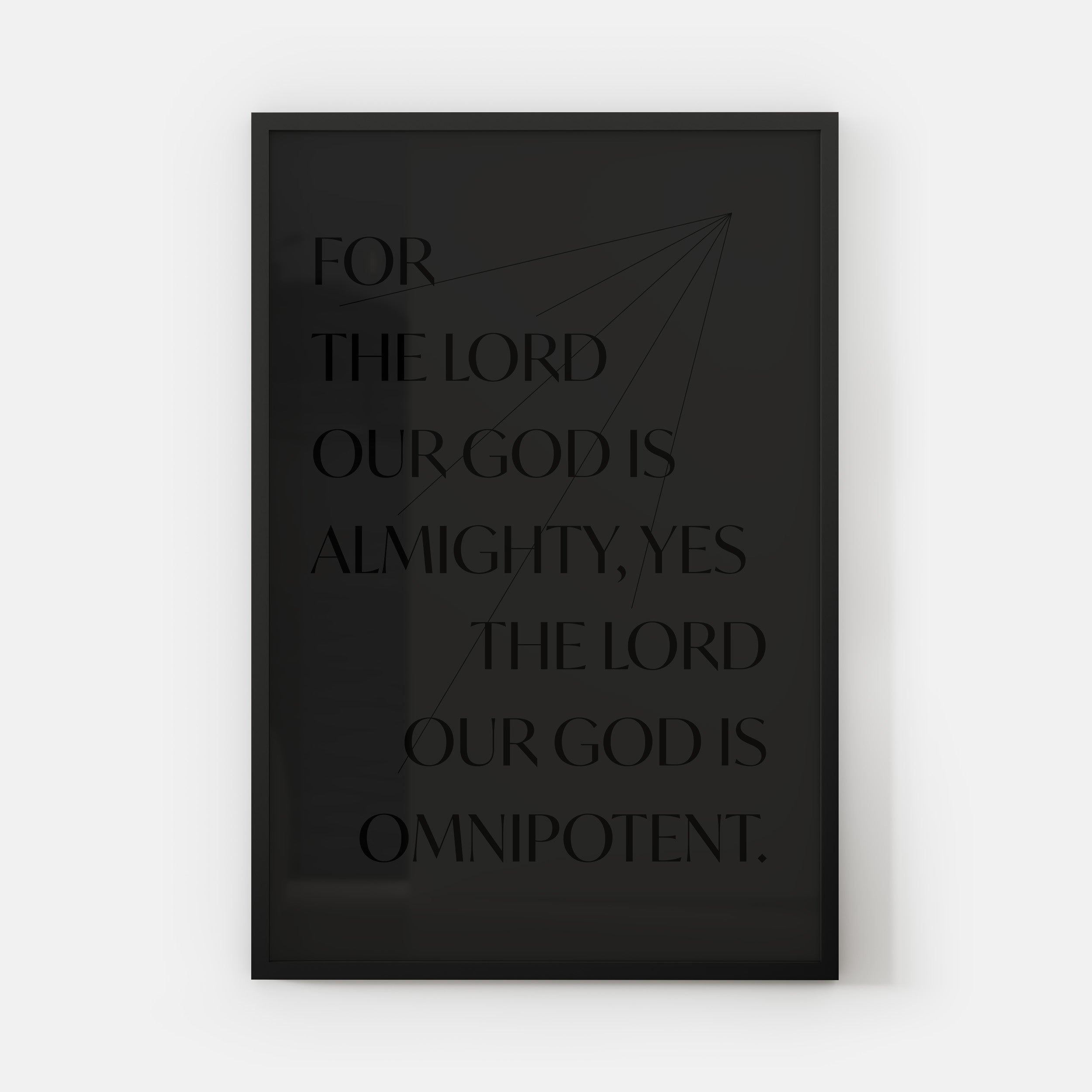 Inspired by the song Revelation 19:1 by A. Jeffrey LaValley. "For the Lord our God is Almighty, Yes the Lord our God is Omnipotent." A matte black typography direction for this Christian art print was taken to bring low contrast as a bold statement.