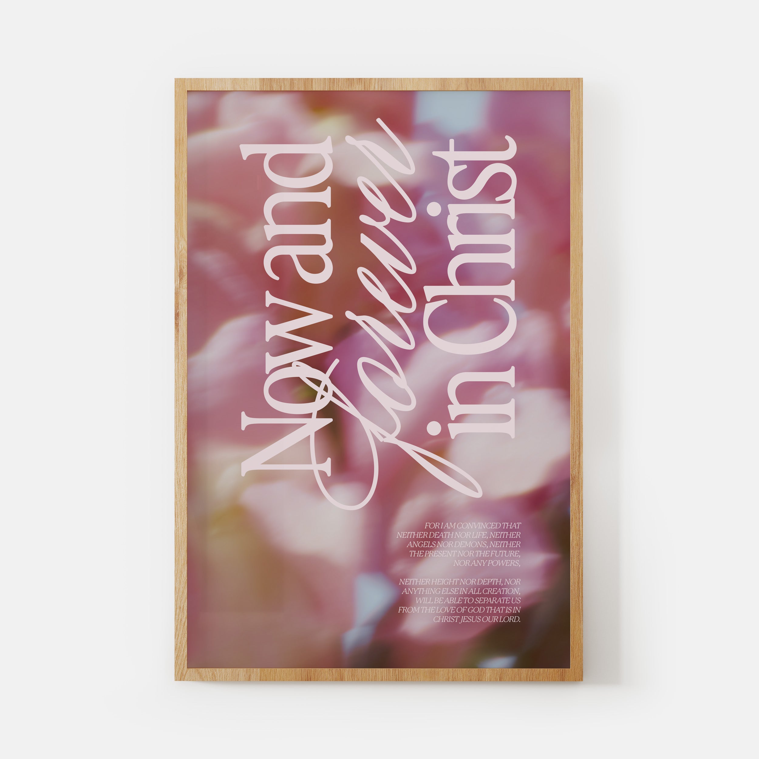 Overlaid the pink flower photography is the dainty font 'Now and Forever in Christ'. A reminder of the love of God that is towards us.