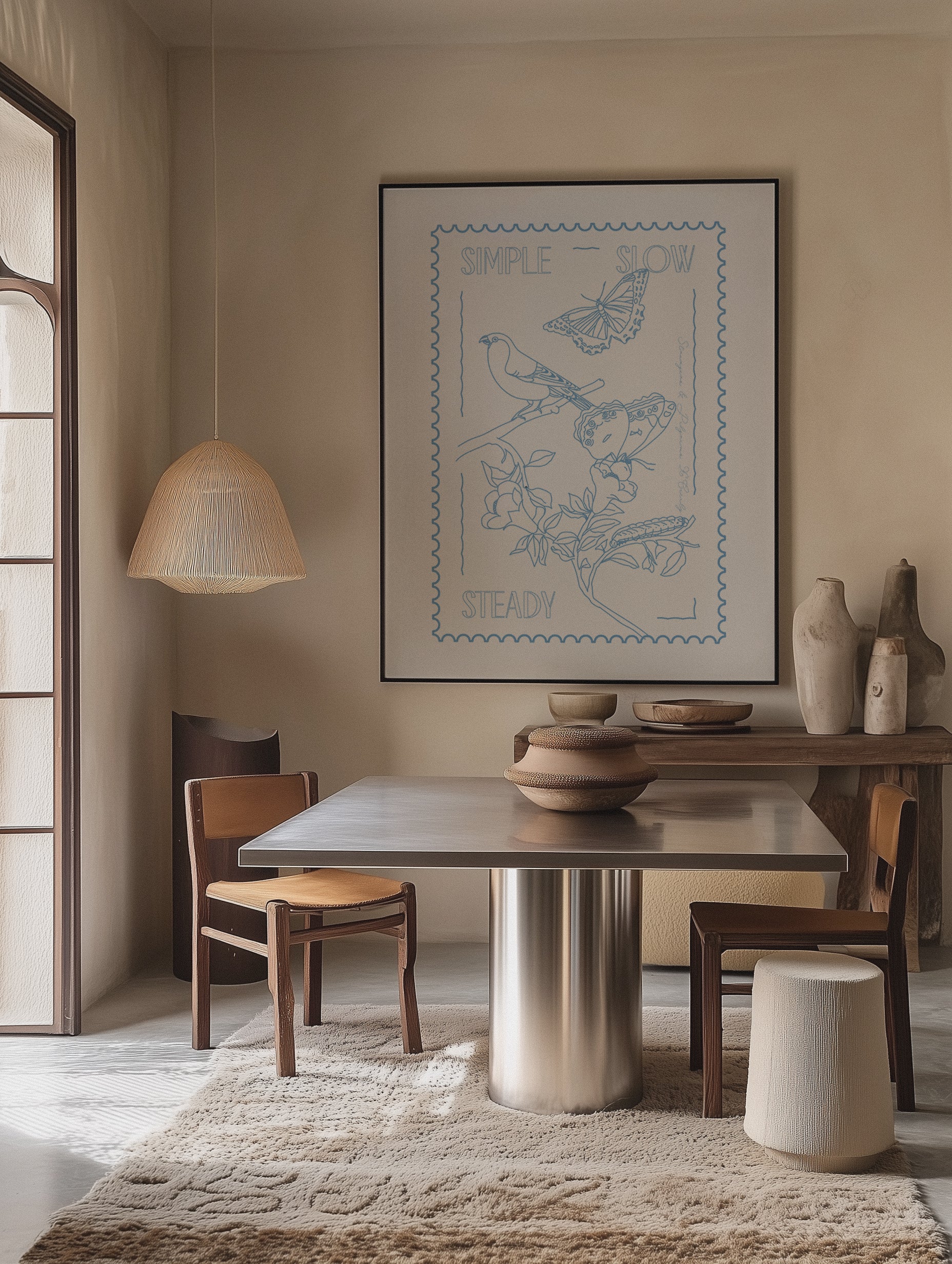 Taking inspiration from vintage postage stamps, nature, and slow, simple living. Illustrations of flora and fauna framed in border elements. Discover more about this art piece in our exclusive interview with Cecily here.