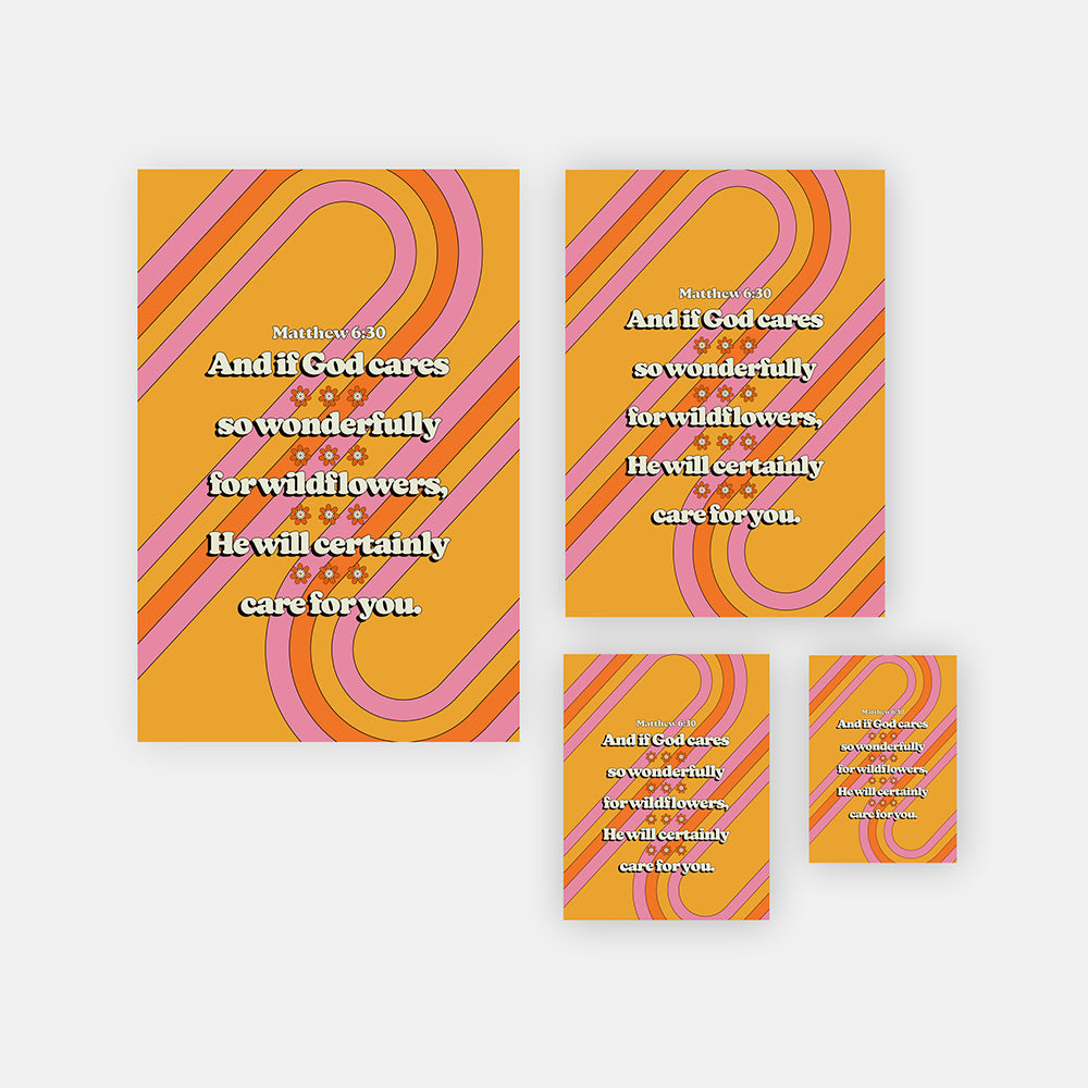 In collaboration with McCall Gilbert we created this art print with vintage and retro design elements inspired by Matthew 6:30 — And if God cares so wonderfully for wildflowers, He will certainly care for you.